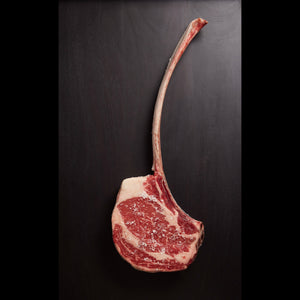 - Long rib bone left in for classic tomahawk presentation